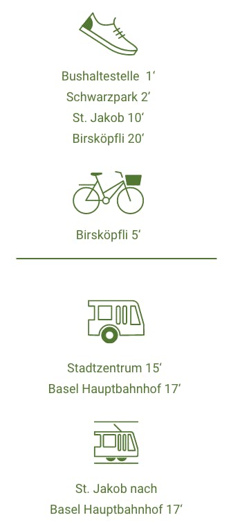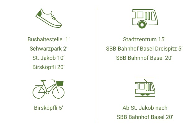 Die Naherholungsgebiete Birs, St. Albanteich und Schwarzpark sind zu Fuss in wenigen Minuten erreichbar. Haltestellen von verschiedenen Bus- und Tramlinien in Richtung Innenstadt befinden sich im Quartier. Auch die Autobahnanschlüsse sind nur wenige Minuten entfernt.