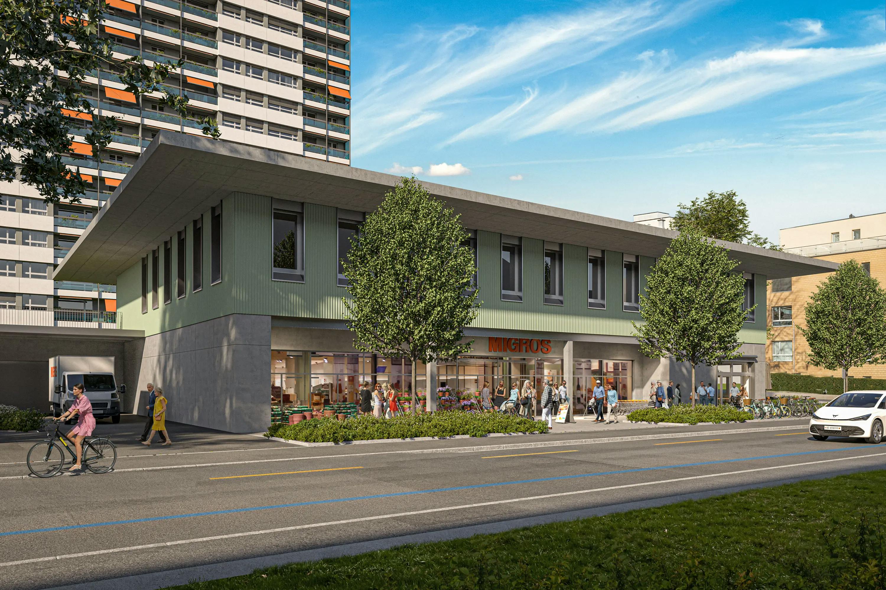 An der Lehenmattstrasse 260 entsteht ein moderner Neubau, der in Zukunft ein Lebensmittelgeschäft, eine Bäckerei und andere Geschäfte und Dienstleister unter einem Dach vereinen wird. Dank dem vielseitigen Angebot entsteht ein neuer Treffpunkt für die Bewohner*innen des Quartiers.